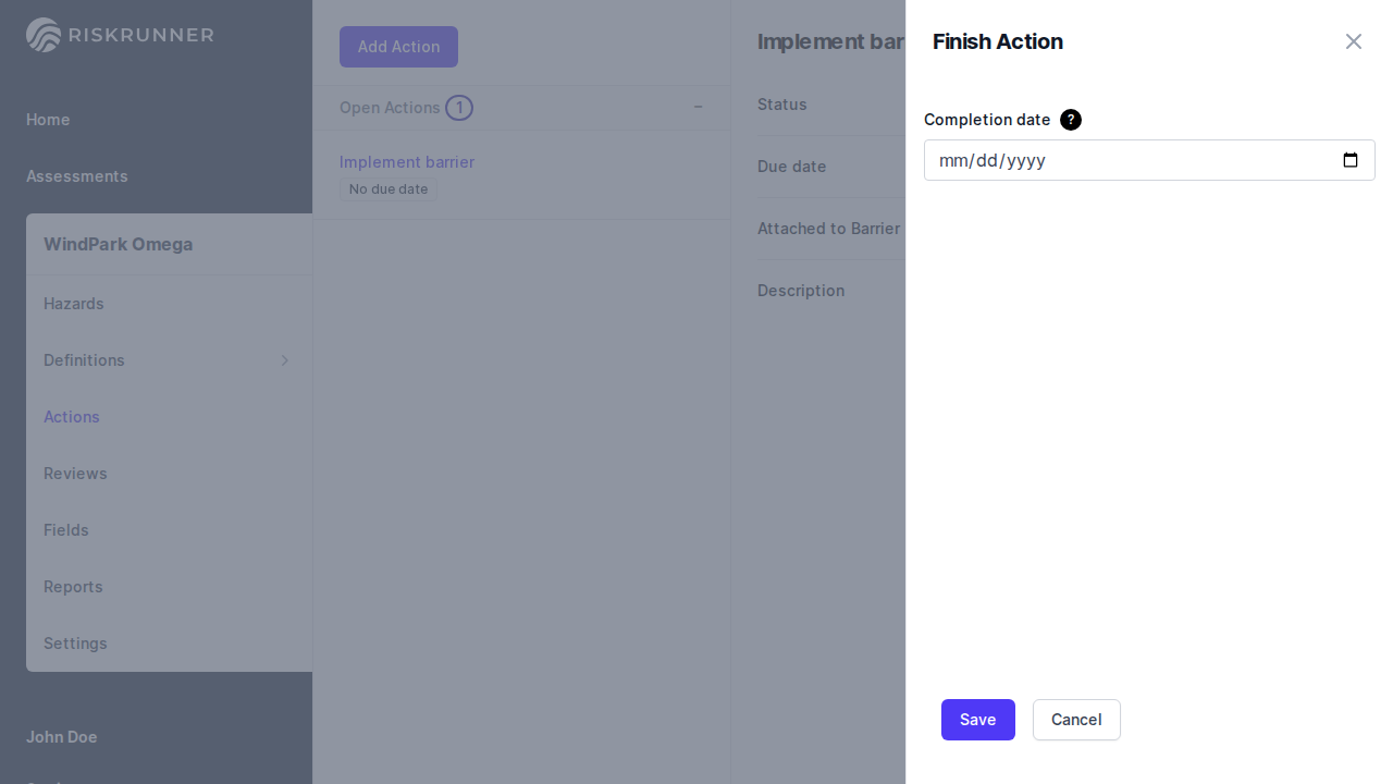 Actions indicator: if you add a new barrier and don’t check the ‘Implemented’ checkbox, you’ll see a red circle with the number of actions that are linked to this barrier (if it’s a new barrier this will be 0). This is the actions indicator. Once you add an action plan to implement this barrier, the indicator will turn blue. If one of those actions goes overdue, the indicator will turn red again. The same will happen if you add an action to a barrier that is already implemented. As long as all the actions are not overdue, the indicator will be blue, but as soon as one goes overdue, the indicator turns red. The indicator disappears once all actions have been completed and the “Implemented” checkbox has been checked.