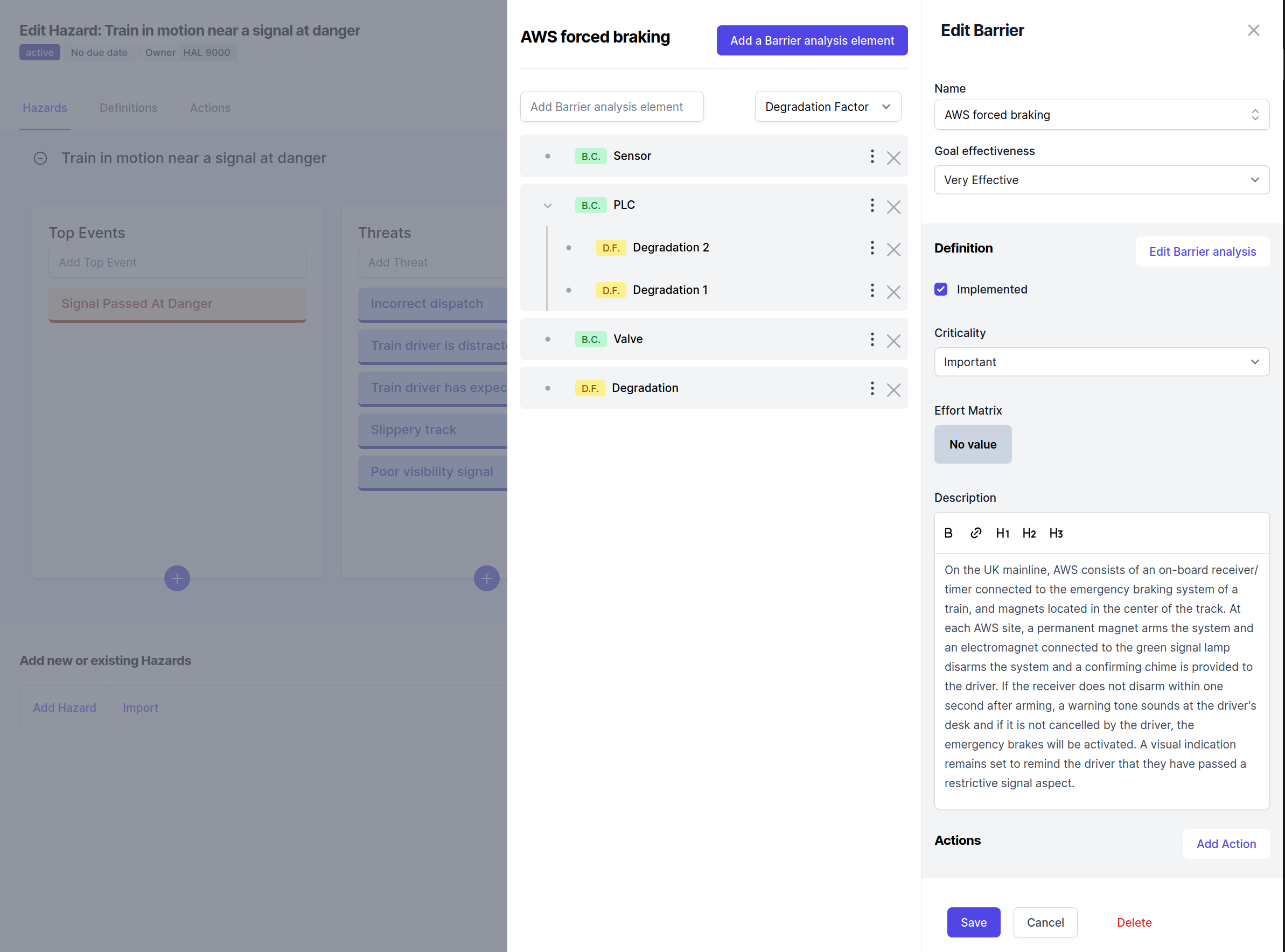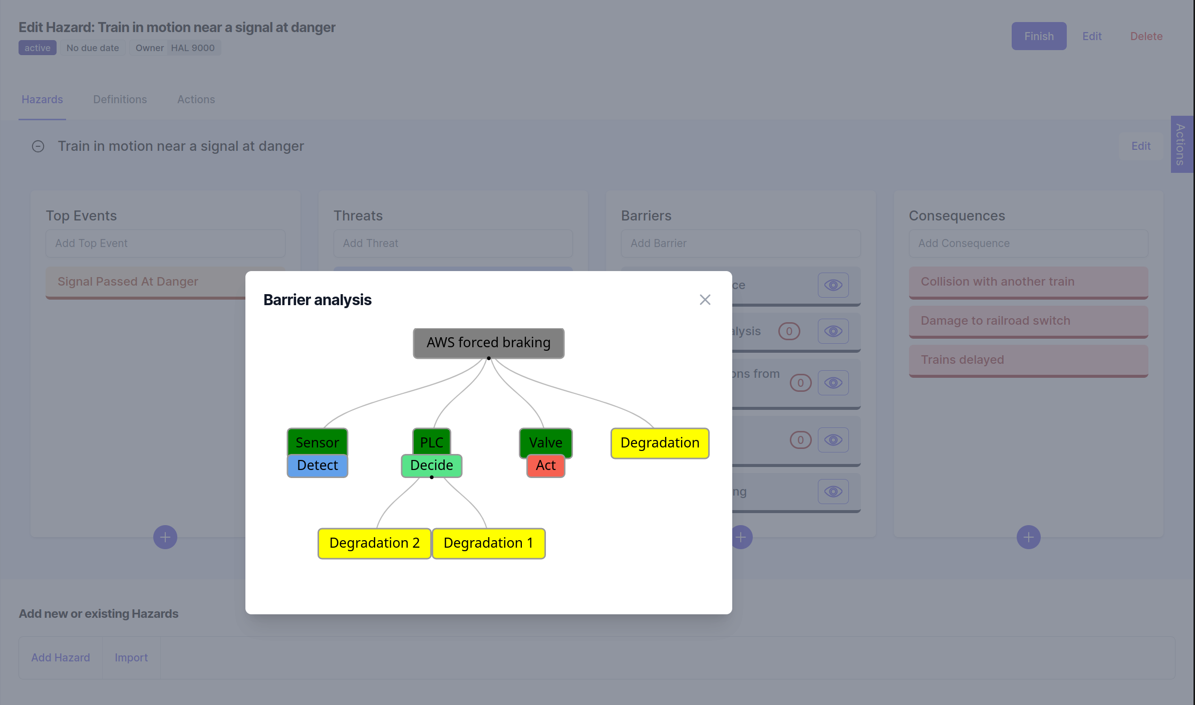 While the editor simplifies adding and editing elements, visualization provides a clear overview. Each barrier in a hazard includes an “eye” icon, which opens the barrier analysis visualization.