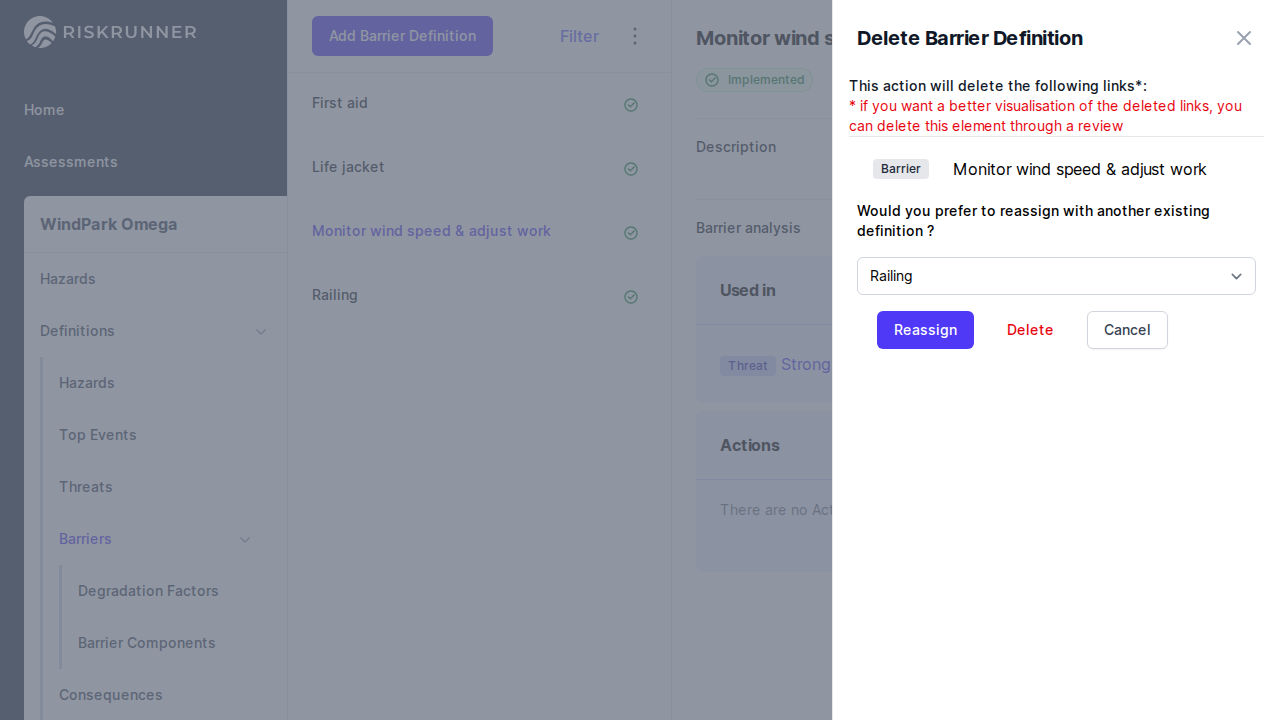 When deleting, you will see all the instance that will be affected (inside a review, you will also be able to assess this part). You can choose to delete the definition or to reassign it (and all it’s link) to another definition.