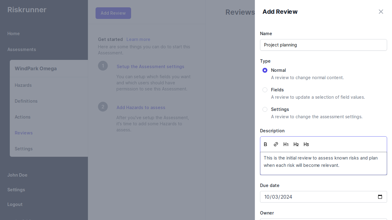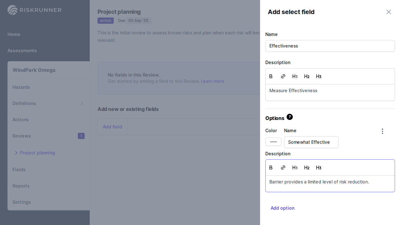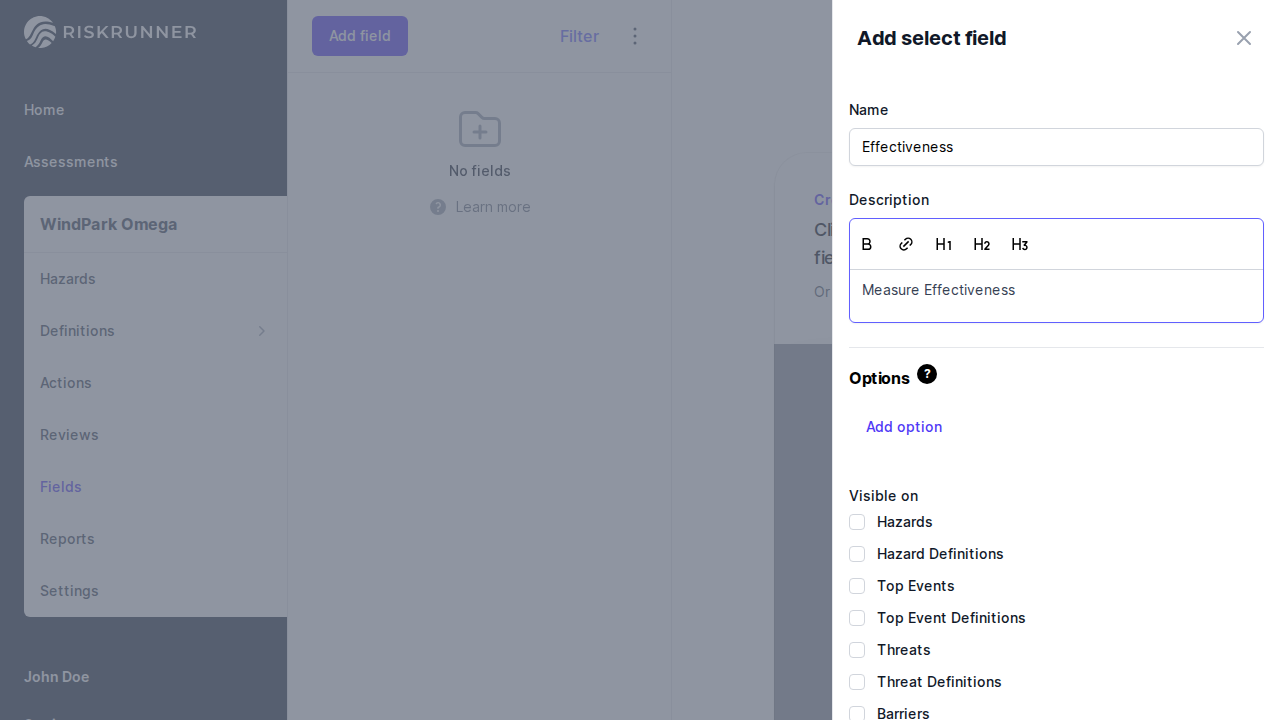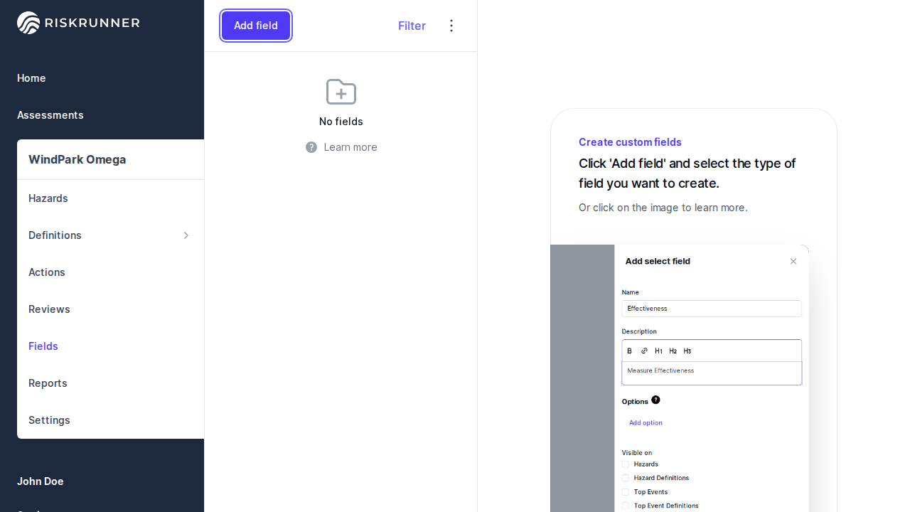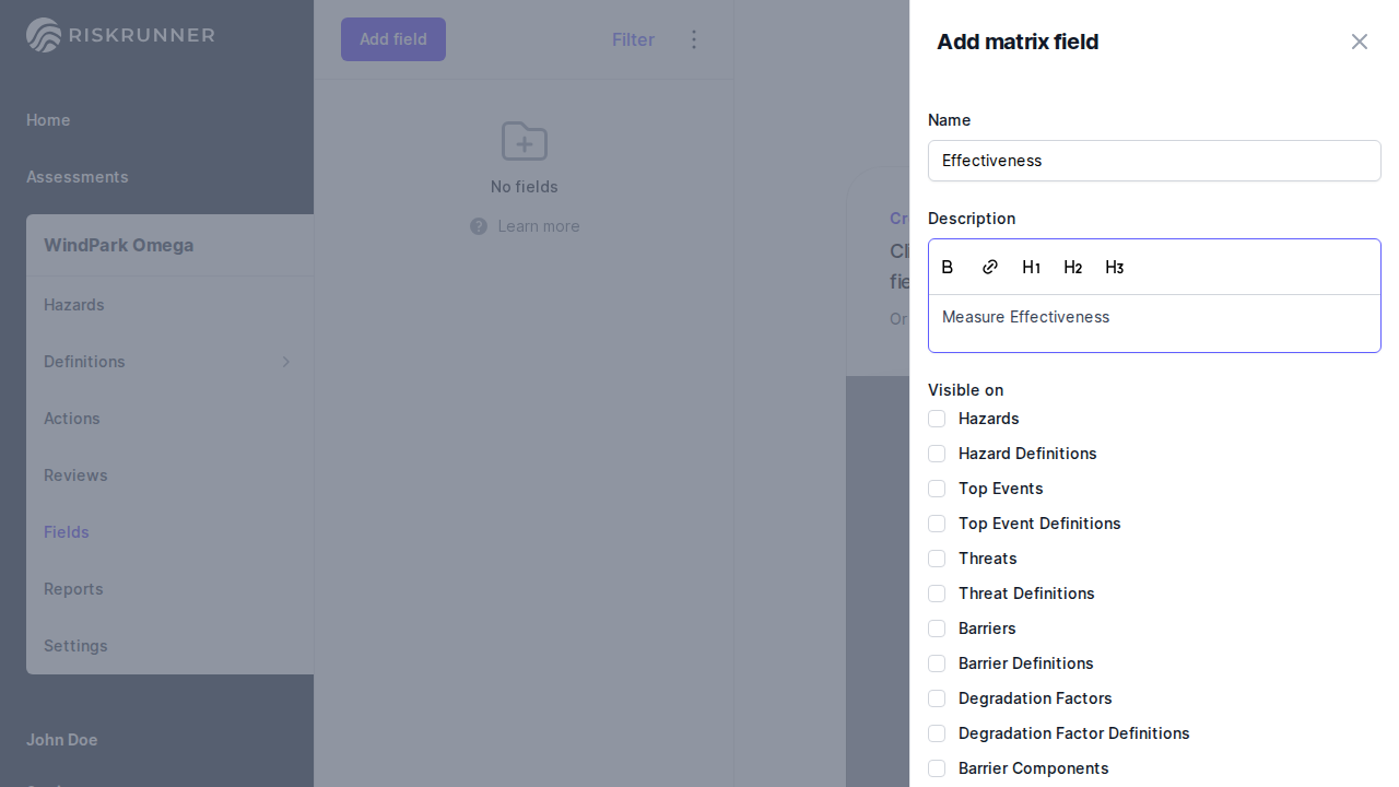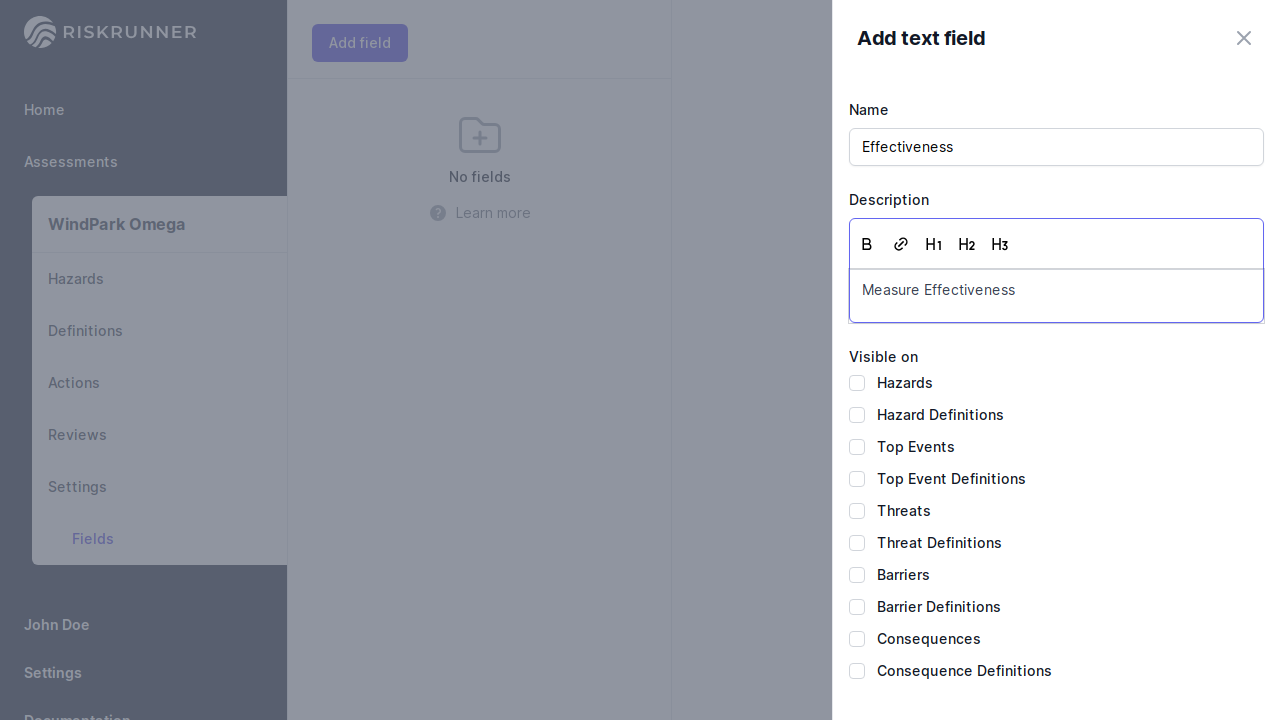 Now that you create an assessement, some definitions and got familiar with review, you probably want to add some fields to assess your hazards.
