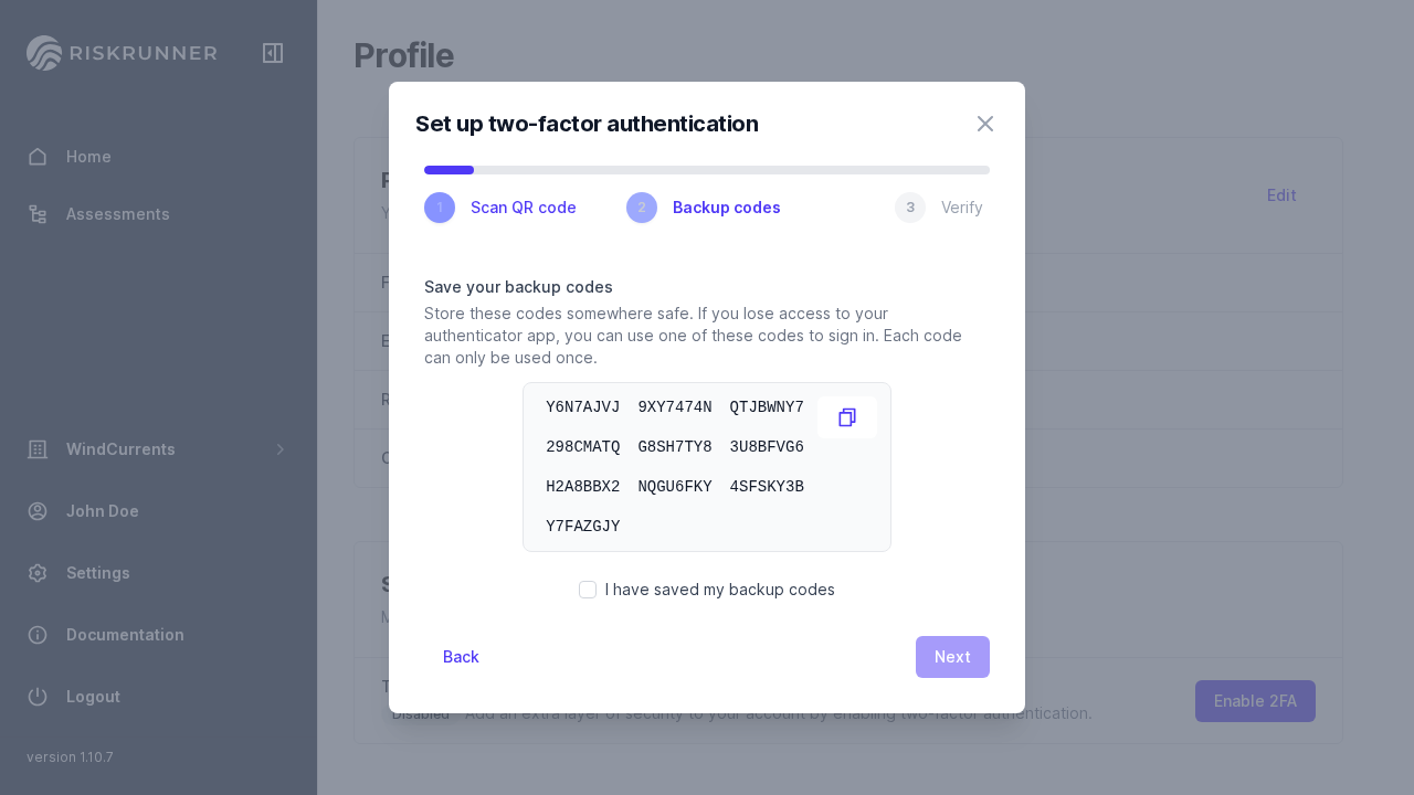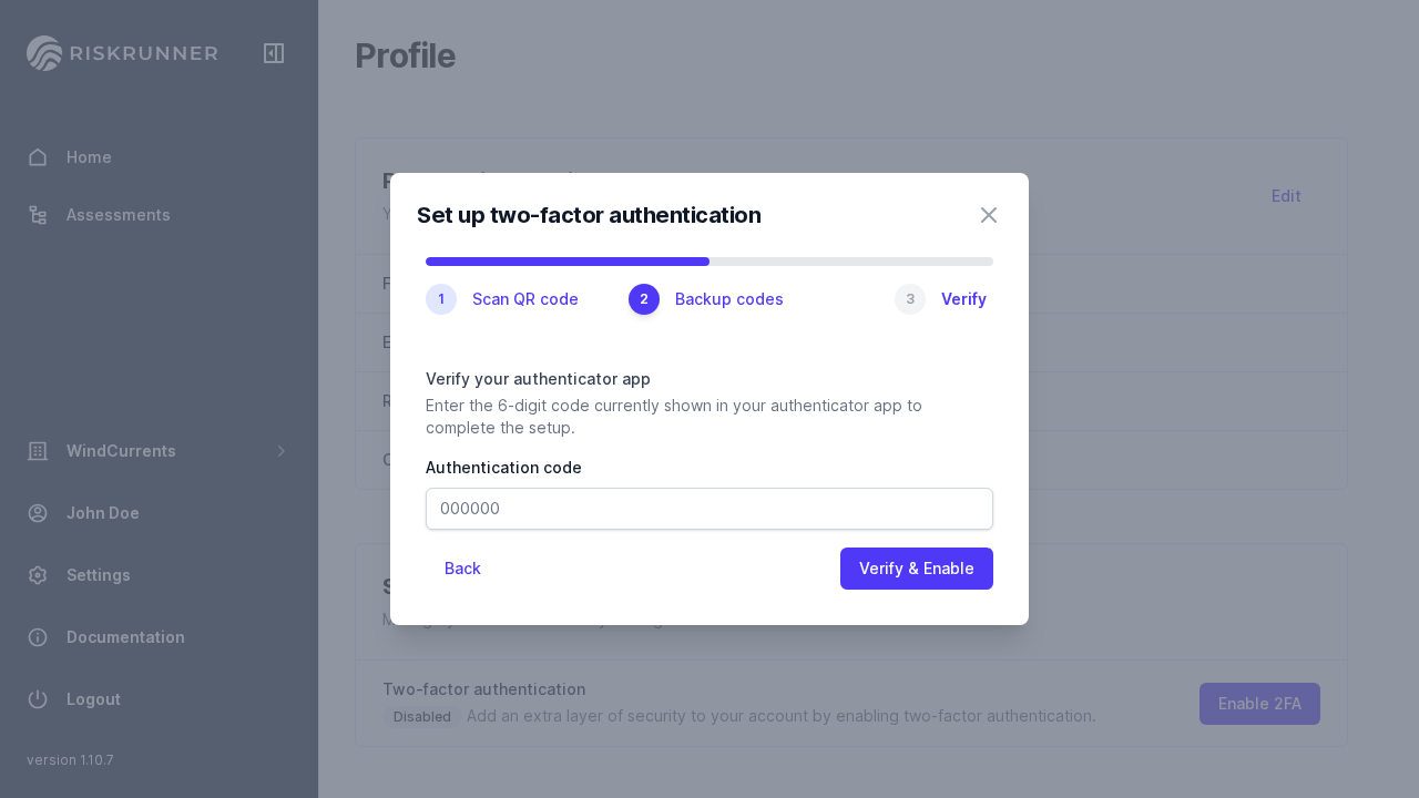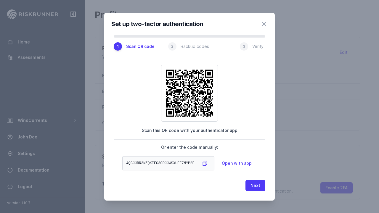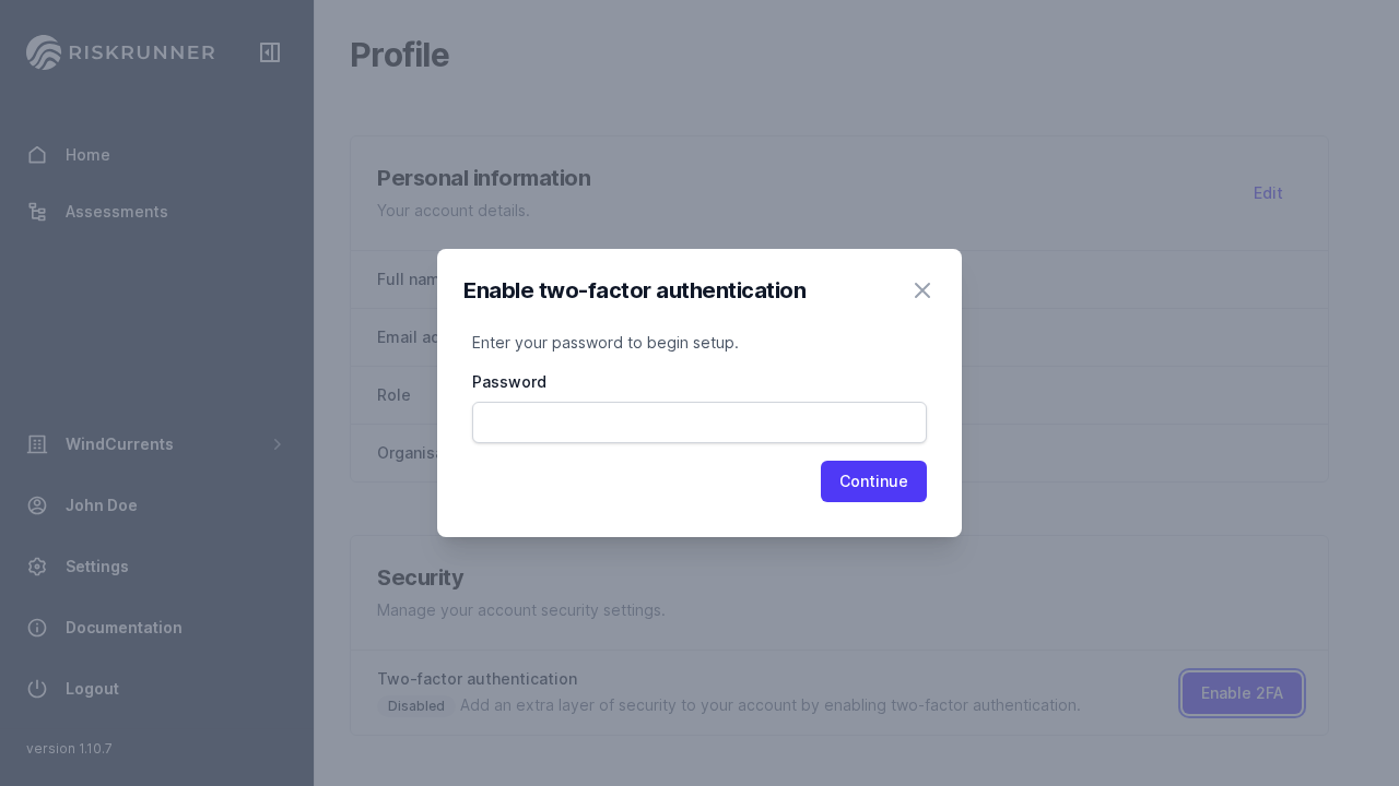 Users who sign in through Single Sign-On (SSO) manage multi-factor authentication through their identity provider. 2FA setup in Riskrunner is not required for those users.